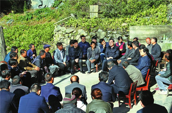 ? (10月10日,省委書記胡和平深入嵐皋縣南宮山鎮(zhèn)西河村,與部分群眾及鎮(zhèn)村干部進行座談,了解扶貧工作進展,聽取群眾意見建議,與大家一起商討脫貧致富的措施。陜西日報記者 宋紅梅/攝)?