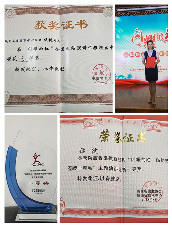 我站血源管理科侯捷同志,根據(jù)自己血站崗位工作成長經(jīng)歷,結(jié)合血源一線招募典型事例,充分展示安康無償獻(xiàn)血招募宣傳模式,以“成長在生命年輪中的信仰”為題,代表安康市中心血站參加陜西省“閃耀的紅--您的故事溫暖一座城”血站系統(tǒng)演講比賽,以獨(dú)特的視角和演講效果奪得冠軍,并選派于9月21日代表陜西省采供血行業(yè)參加“閃耀的紅”全國血站演講比賽榮獲三等獎(jiǎng),是我站首次在全省、全國演講比賽中取得的最佳成績,為我站在全國范圍內(nèi)贏得了榮譽(yù),為安康、陜西血站行業(yè)系統(tǒng)爭了光,在全國血液行業(yè)內(nèi)展示了我站職工昂揚(yáng)向上的精神風(fēng)貌。