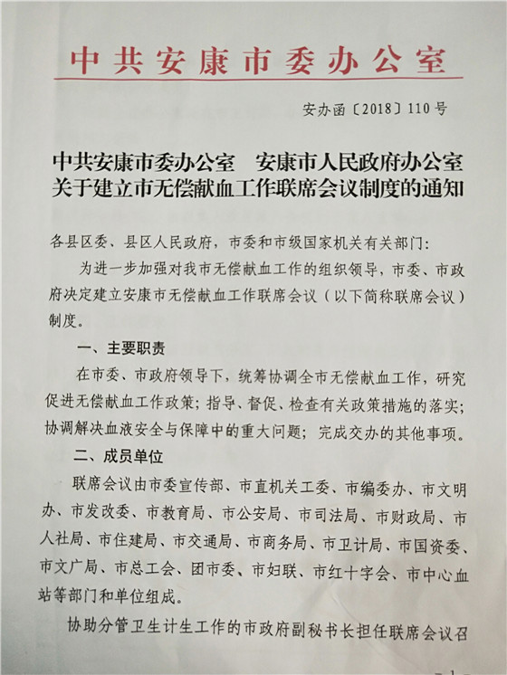 2、安康市率先在全省建立首個(gè)無償獻(xiàn)血聯(lián)系會議制度 安康無償獻(xiàn)血聯(lián)席會議制度是在安康市委、市政府領(lǐng)導(dǎo)下,由市委宣傳部等21個(gè)市級部門和單位組成,協(xié)助分管衛(wèi)生計(jì)生工作的市政府副秘書長擔(dān)任聯(lián)席會議召集人。聯(lián)席會議每年召開一次全體會議,主要職責(zé)為統(tǒng)籌協(xié)調(diào)全市無償獻(xiàn)血工作,研究促進(jìn)無償獻(xiàn)血工作相關(guān)政策,指導(dǎo)、督促、檢查有關(guān)政策措施的執(zhí)行落實(shí),協(xié)調(diào)解決血液安全與保障中的重大問題。聯(lián)系會議制度的建立,標(biāo)志著我市無償獻(xiàn)血宣傳招募模式“政府主導(dǎo)、部門協(xié)作、社會參與、城鄉(xiāng)聯(lián)動(dòng)”的發(fā)展格局和長效機(jī)制得到進(jìn)一步鞏固和提升。