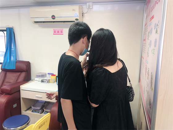 中秋節(jié)不僅街上熱鬧,獻(xiàn)血車(chē)上也熱鬧,鄧孟杰正坐在采血椅上獻(xiàn)血,他漂亮大方的女友站在旁邊跟他聊著晚上要吃什么,女友的弟弟坐在遠(yuǎn)一點(diǎn)的地方玩著手機(jī),女友的媽媽則坐在體檢桌前測(cè)量血壓,“一人獻(xiàn)血,三人陪同”的場(chǎng)景著實(shí)有點(diǎn)可愛(ài),但鄧孟杰笑得十分開(kāi)心,一直想獻(xiàn)血的他特別選了中秋這個(gè)日子,大概也是想和愛(ài)人親人一起分享這種美妙的人生體驗(yàn)。鄧孟杰的女友拿起他的獻(xiàn)血證撒嬌到:“這次我們陪你,下次你也要陪我來(lái)獻(xiàn)血。”說(shuō)完把手機(jī)塞給了一旁的弟弟,指揮他給自己和男友拍合照,一邊打趣弟弟拍照技術(shù)不好一邊把男友手里獻(xiàn)血證的位置調(diào)了又調(diào)。