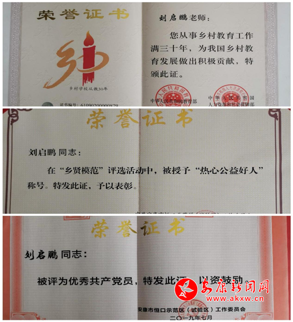 劉啟鵬先后獲得教育部、人力資源和社會保障部授予“鄉(xiāng)村學(xué)校從教30年”榮譽(yù)證書,被區(qū)鎮(zhèn)評為“鄉(xiāng)賢模范”和“優(yōu)秀共產(chǎn)黨員”等先進(jìn)個人。