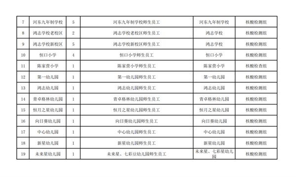 恒口示范區(qū)中心城區(qū)重點(diǎn)人群:一是黨政機(jī)關(guān)、企事業(yè)單位返崗人員、中小學(xué)校。幼兒園返校人員;二是“五一”假期有市域外旅居史人員;三是41類重點(diǎn)人群;四是市域外來恒返恒核酸檢測結(jié)果超過48小時人員;五是愿檢人員。