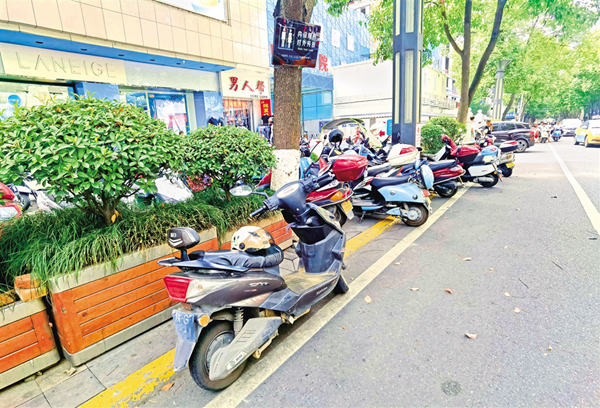 6月18日,在安康城區(qū)金州南路人行道上,部分車(chē)輛占用盲道、車(chē)身超出停車(chē)線(圖1),未按要求停放車(chē)輛(圖2),造成了安全隱患。(記者 張喬 攝)