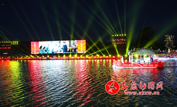 晚會(huì)在嘹亮激昂的獨(dú)唱《東方紅》中拉開序幕,緊接著,磅礴大氣的歌舞串燒《我和我的祖國》《萬疆》《愛我中華》,如詩如畫的水上表演《南湖紅船》《江南水鄉(xiāng)》《滾滾長(zhǎng)江東逝水》,動(dòng)力澎湃的RAP時(shí)尚秀《門戶新安康》,美輪美奐歌舞表演《我的深情為你守候》《為祖國干杯》《送你一個(gè)長(zhǎng)安》《我愛你,中國》《領(lǐng)航》等節(jié)目相繼登臺(tái)表演,與此同時(shí),絢麗多彩的燈光秀和仙氣飄飄的霧森特效穿插其中,不斷將演出推向高潮。最后,整場(chǎng)演出在大合唱《沒有共產(chǎn)黨就沒有新中國》的歌聲中圓滿落下帷幕。