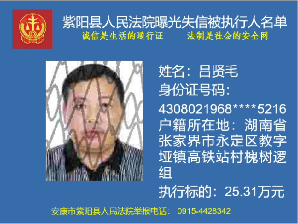 曝光失信 | 紫陽(yáng)縣人民法院:關(guān)于敦促呂賢毛履行法定義務(wù)的公告