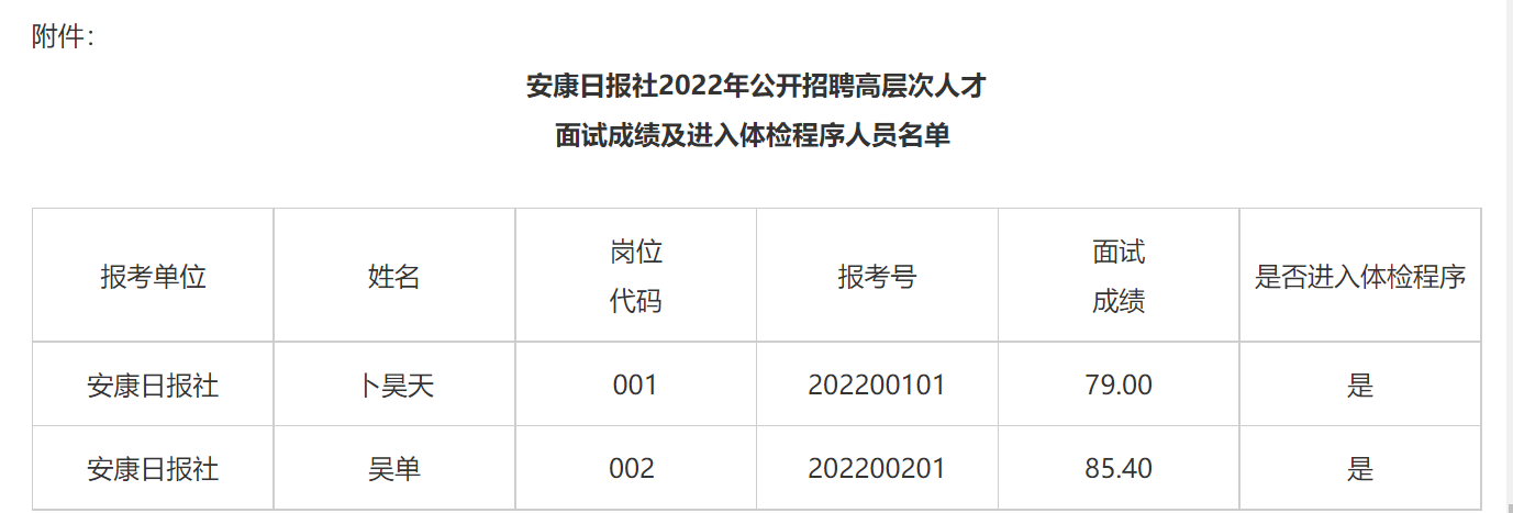 根據(jù)《安康日報社2022年公開招聘高層次人才公告》規(guī)定,現(xiàn)將安康日報社2022年公開招聘高層次人才面試成績及進(jìn)入體檢程序人員名單(見附件)、體檢有關(guān)事項,公告如下: