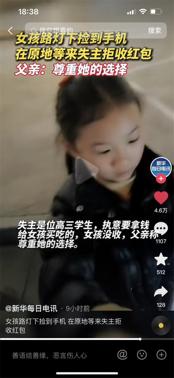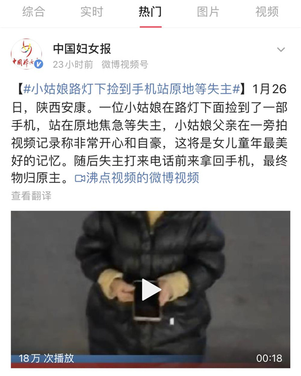 1月28日下午,#女孩撿手機(jī)站原地等失主##小姑娘路燈下?lián)斓绞謾C(jī)站原地等失主#話題沖上了抖音熱門、微博熱門,廣大網(wǎng)友紛紛點贊。