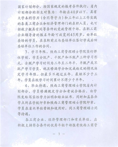 按照省政府有關(guān)文件規(guī)定,學(xué)員修滿規(guī)定的課程學(xué)分,完成畢業(yè)論文,通過(guò)論文答辯及評(píng)審后,由陜西工商管理碩士學(xué)院頒發(fā)畢業(yè)證書(shū)和學(xué)力證明。學(xué)員在省內(nèi)單位晉級(jí)和使用時(shí),視同工商管理碩士。