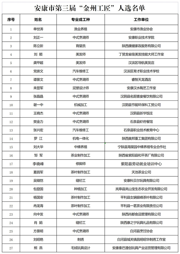 根據(jù)市委組織部、市總工會、市人社局《關于開展第三屆“金州工匠”評選活動的通知》(安人社函〔2022〕243號)和《安康市“金州工匠”評定辦法》,經(jīng)申報、評審并征求有關部門意見,擬評選安康市漁業(yè)協(xié)會單世濤等27人為安康市第三屆“金州工匠”,現(xiàn)予公示,公示期自2023年3月28日至2023年4月3日。