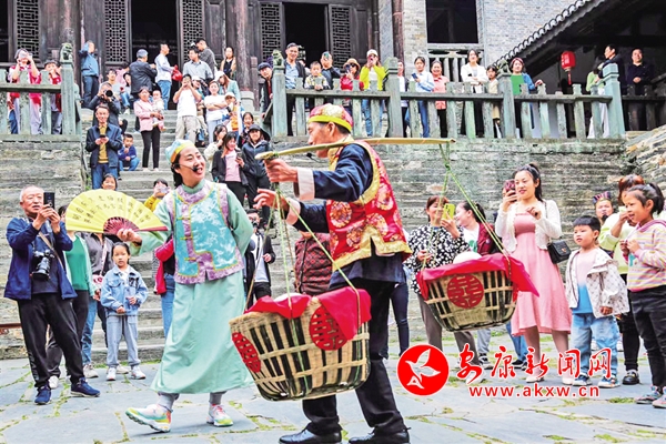 5月1日,旬陽市蜀河古鎮(zhèn)展示傳統(tǒng)民俗文化引來游人喝彩。李春江 攝