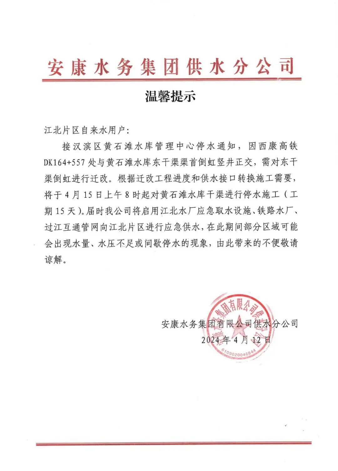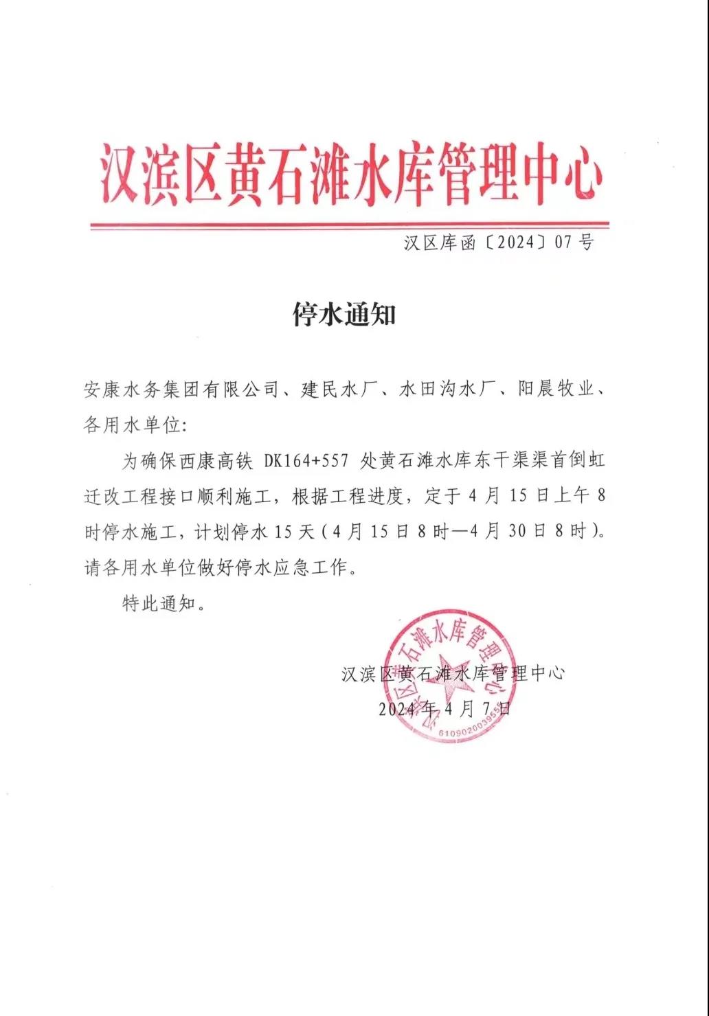 本網(wǎng)訊 4月12日,安康水務(wù)集團有限公司供水分公司發(fā)布停水通知:因西康高鐵DK164+557處與黃石灘水庫東干渠渠首倒虹豎井正交,需對東干渠倒虹進行遷改。根據(jù)遷改工程進度和供水接口轉(zhuǎn)換施工需要,將于4月15日上午8時起對黃石灘水庫干渠進行停水施工(工期15天)。