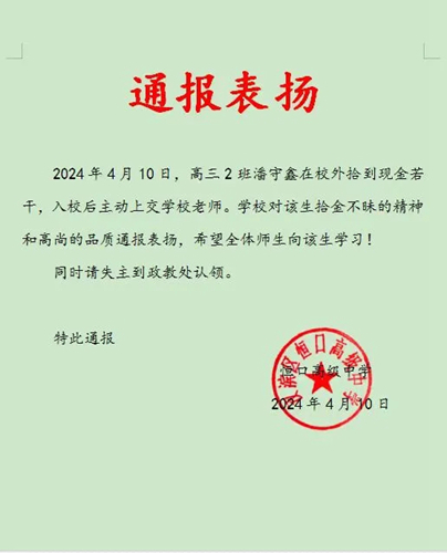 2024年4月10日早晨,高三2班潘守鑫同學(xué)在校門口拾到人民幣若干,在原地等了一會(huì)沒(méi)有失主來(lái)找,他毫不猶豫地走進(jìn)校園把錢交給政教處劉顯平老師。潘守鑫同學(xué)的行為展現(xiàn)了恒中學(xué)子良好的社會(huì)公德和個(gè)人素養(yǎng),為同學(xué)們樹(shù)立了一個(gè)好榜樣!