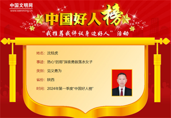 沈桂虎,男,1982年2月生,陜西省漢陰縣某公司出租車駕駛員。沈桂虎出車時(shí)路遇一女子落水,不顧危險(xiǎn)毅然跳入水中施救,女子因搶救及時(shí)脫離危險(xiǎn)。沈桂虎曾獲“陜西好人”等榮譽(yù)。