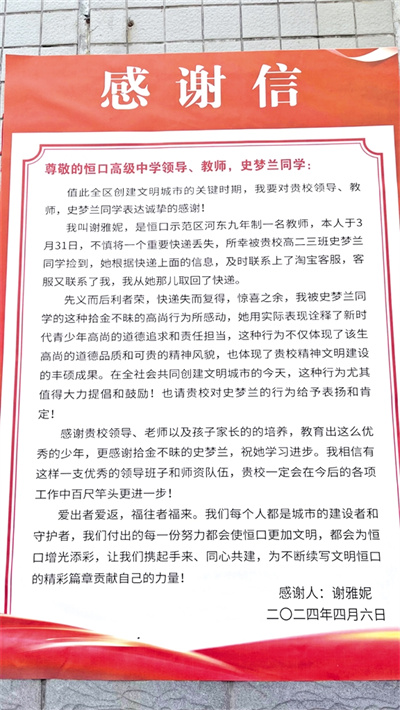 小城大愛(ài),溫暖無(wú)處不在。近日,在恒口高級(jí)中學(xué),河?xùn)|九年制學(xué)校教師謝雅妮給該校學(xué)生史夢(mèng)蘭送來(lái)了一封暖意融融的感謝信,向她拾金不昧的行為表示感謝,也為學(xué)校的德育工作點(diǎn)贊。