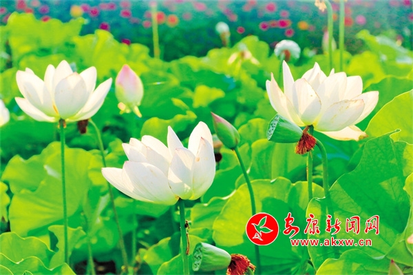 時(shí)至今日,倘單從觀(guān)賞的角度講,漢陰縣雙乳鎮(zhèn)的千畝荷塘所營(yíng)造的美景,亦是難得一見(jiàn)的。置身荷塘邊,千澄一碧。人仿佛闖進(jìn)荷的世界,頓生突兀、渺小之感,“接天蓮葉無(wú)窮碧,映日荷花別樣紅”中的無(wú)窮,就是此番氣象。那些翠綠的荷葉似圓盤(pán)一般,密密匝匝,不透一絲縫隙。而除了滿(mǎn)目的綠葉,高高低低間,荷花娉婷裊裊地立在荷塘,沖擊著人的視覺(jué)。那些吸引人眼球的粉白花朵,在藍(lán)天白云、青山綠水的映襯下,格外讓人憐愛(ài)。