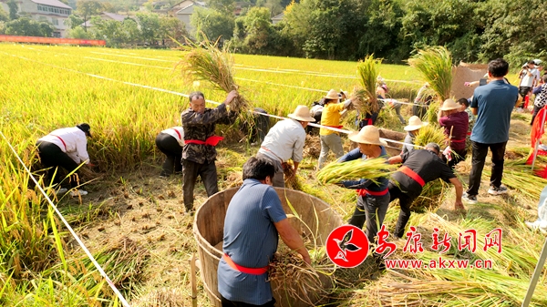 穗滿田頭谷滿倉,稻魚飄香慶豐年。稻田里,緊張激烈、歡快熱鬧的割稻、甩谷及釣魚比賽正在進行,只見一株株水稻隨著鐮刀的刷刷聲倒下,一把把稻穗隨著摔打脫落為金色的谷粒,一條條稻魚在手中躍動,大家爭分奪秒、你追我趕,一派熱火朝天的景象。