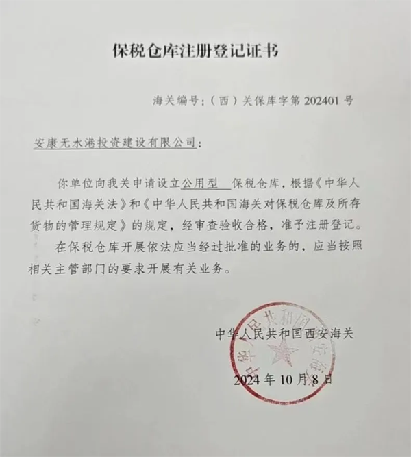 10月8日,由恒口示范區(qū)申請設立的“公用型保稅倉庫”正式通過海關審查驗收,成功獲得由西安海關頒發(fā)的《保稅倉庫注冊登記證書》,標志著該保稅倉已具備正式運營資質和能力,可正式對外開展實際業(yè)務。