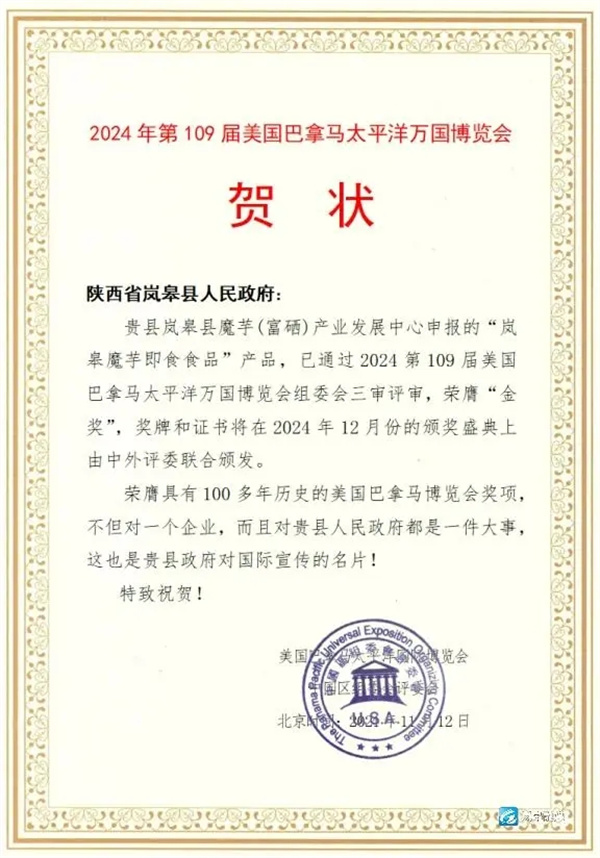 1月8日,筆者從泰國曼谷舉行的2024年第109屆美國巴拿馬太平洋萬國博覽會頒獎(jiǎng)盛典上獲悉,由嵐皋縣魔芋產(chǎn)業(yè)發(fā)展中心申報(bào)的“嵐皋魔芋即食食品”,榮膺2024年第109屆美國巴拿馬太平洋萬國博覽會“金獎(jiǎng)”。