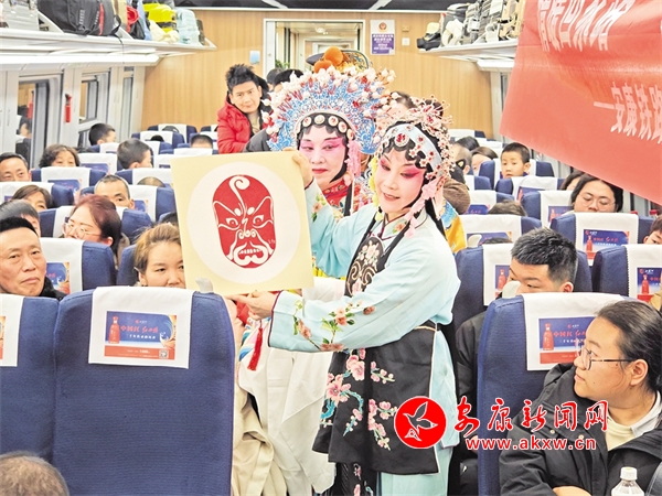 火車穿越秦巴山水間,途中,來自安康漢調(diào)二黃研究院的專業(yè)演員和地方民間漢調(diào)二黃愛好者們一同表演了國家級非物質(zhì)文化遺產(chǎn)——漢調(diào)二黃經(jīng)典戲曲演唱,并為旅客們講解漢調(diào)二黃戲曲知識,與旅客們開展互動交流,讓旅客親身體驗(yàn)漢調(diào)二黃戲服道具,感受漢調(diào)二黃的獨(dú)特藝術(shù)魅力。來自漢濱區(qū)文化館的漢濱剪紙技藝傳承人為旅客們展示講解了安康市級非物質(zhì)文化遺產(chǎn)——漢濱剪紙技藝,向參與互動的旅客送上了親手創(chuàng)作的漢濱剪紙作品,提前送上新春祝福?;顒又?,西安鐵路公安局安康公安處的民警們和文藝工作者們一同宣傳普及了反詐知識,進(jìn)一步提升旅客的安全防范意識。