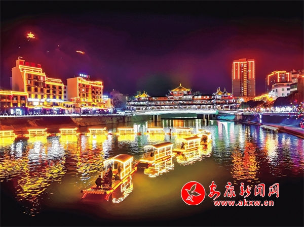 夜色漸濃,河堤兩岸被千盞燈籠裝飾一新,吉祥如意景觀燈廊,十二生肖、盛世龍門等各式造型的燈飾以及十二生肖竹排,與嵐河、廊橋交織成一片璀璨星河,如夢(mèng)如幻。不少市民游客駐足觀看、拍照打卡。