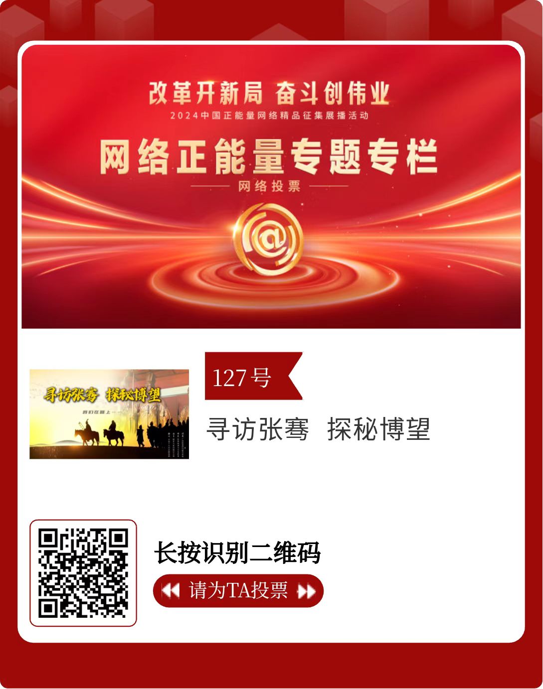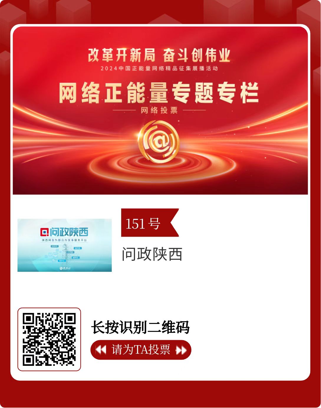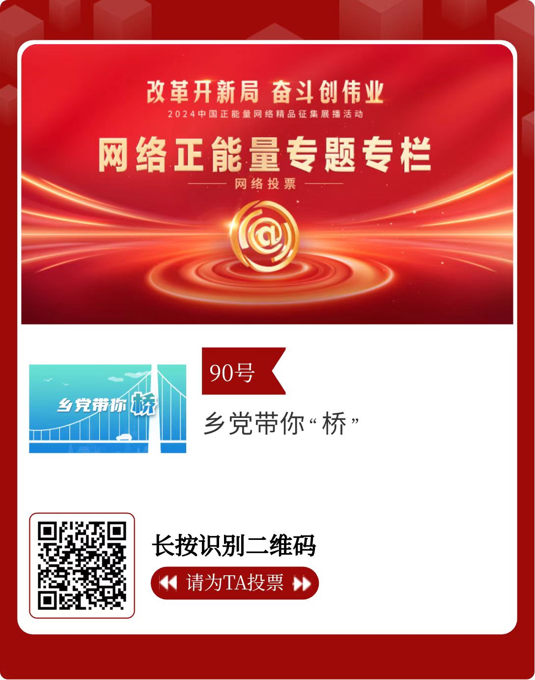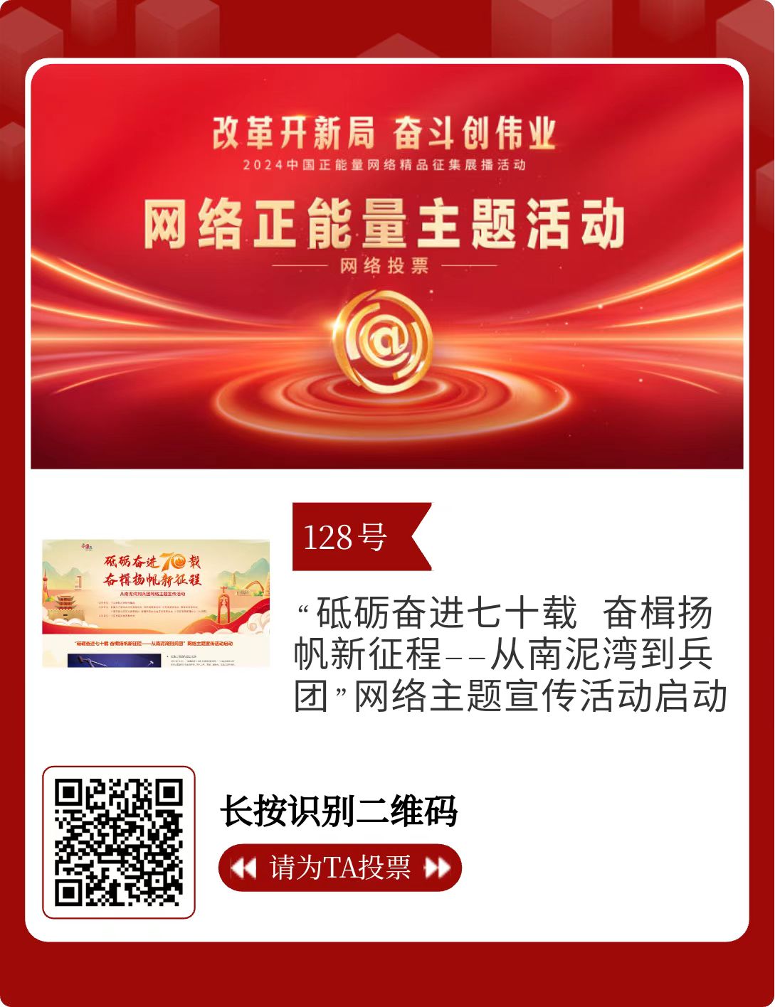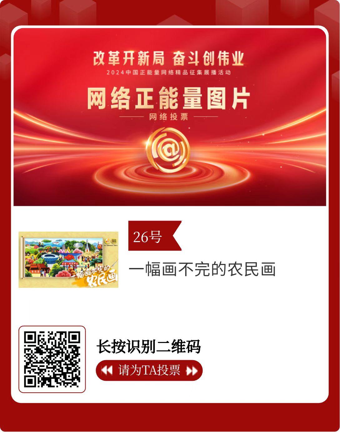 改革開(kāi)新局,奮斗創(chuàng)偉業(yè)。由中央網(wǎng)信辦主辦的2024中國(guó)正能量網(wǎng)絡(luò)精品征集展播活動(dòng)今天啟動(dòng)網(wǎng)絡(luò)展播投票。
