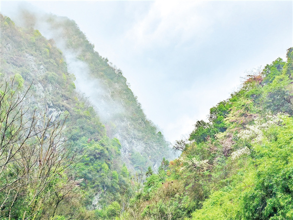謝坪的茶園已經(jīng)開園,走進郁郁蔥蔥的茶田,露水在新抽的芽尖上凝成珠串,鮮翠欲滴。勤勞的采茶人趁著雨停正在采茶,手指翻飛間竹簍里的鮮葉便堆得冒尖,溢出淡淡的茶葉清香。抬頭看去,半山腰的野櫻花也從巖縫里斜斜地探出來,粉白的花瓣在淡淡云霧的映襯下顯得更加鮮艷,偶有一道陽光穿透云層,將櫻花染成半透明的緋色,整座山坡便成了流動的云霞。