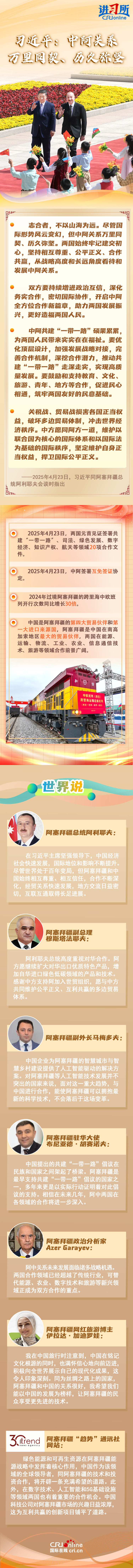 4月23日,中國(guó)國(guó)家主席習(xí)近平在北京同阿塞拜疆總統(tǒng)阿利耶夫舉行會(huì)談。兩國(guó)元首宣布,建立中阿全面戰(zhàn)略伙伴關(guān)系。習(xí)近平指出,盡管國(guó)際形勢(shì)風(fēng)云變幻,但中阿關(guān)系萬(wàn)里同契、歷久彌堅(jiān)。雙方要持續(xù)增進(jìn)政治互信,深化務(wù)實(shí)合作,密切國(guó)際協(xié)作,開(kāi)啟中阿全方位合作新篇章,助力兩國(guó)發(fā)展振興,更好造福兩國(guó)人民。