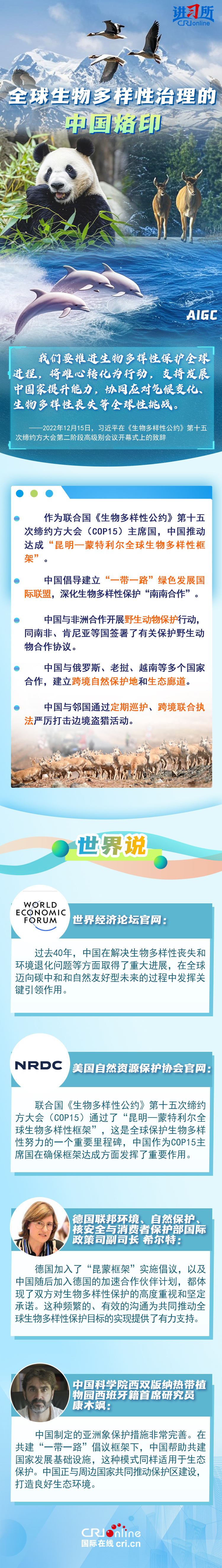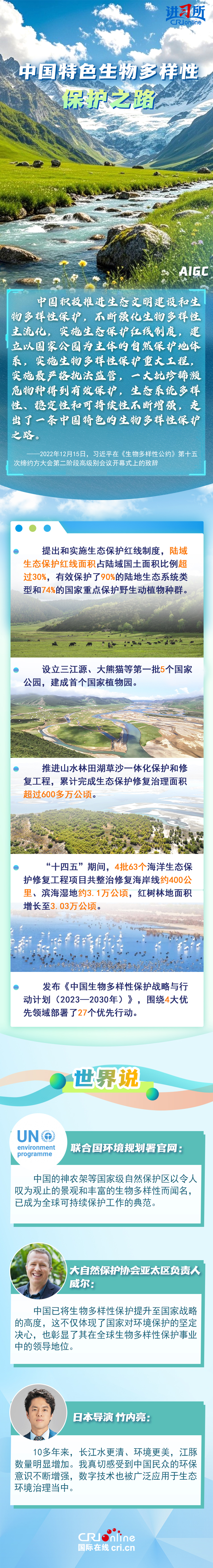 “心往一處想、勁往一處使,共建地球生命共同體。”作為最早簽署、批準(zhǔn)《生物多樣性公約》的締約方之一,生物多樣性保護已經(jīng)上升為中國的國家發(fā)展戰(zhàn)略。國際人士表示,中國的一系列舉措體現(xiàn)出對生態(tài)環(huán)境保護的堅定決心,同時,中國依托共建“一帶一路”倡議等國際合作機制,為推動全球生物多樣性保護提供了有力支持,在邁向自然友好型未來的過程中發(fā)揮關(guān)鍵的引領(lǐng)作用。