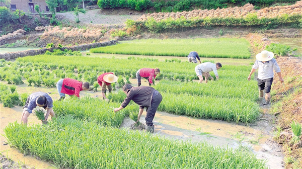 只見水田中村民們排成整齊的隊列,左手攥秧苗,右手飛快地從秧把中分出幾株,拇指與食指輕捻,穩(wěn)穩(wěn)插入泥中。彎腰、分苗、插秧,整套動作一氣呵成,不過兩三秒。濕潤的泥土裹挾著稻苗的清香,在插秧的節(jié)奏中升騰,勾勒出傳統(tǒng)農(nóng)耕的詩意與韻律。“別看這插秧動作簡單,講究可不少。秧苗入土深度要適中,太淺容易漂,太深影響生長。”王嬸直起腰擦了把汗,褲腳沾滿泥漿卻笑得開懷,“這手藝都是祖輩傳下來的,我們種了一輩子地,只盼著秧苗茁壯成長。”