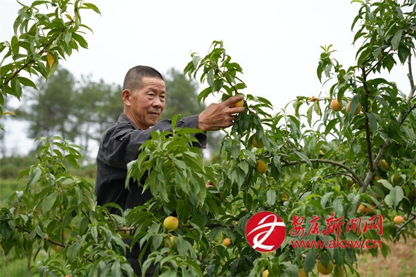 雙乳鎮(zhèn)江河村的黃桃產(chǎn)業(yè)園里也是一派豐收忙碌的喜人景象。成片的桃樹上,一顆顆成熟的黃桃身披紙質(zhì)“防護(hù)衣”,密密麻麻掛滿枝頭,微風(fēng)拂過,果香撲鼻,令人饞涎欲滴。務(wù)工群眾在林間來回穿梭,忙著采摘、運(yùn)輸成熟的黃桃,桃林間一片繁忙。