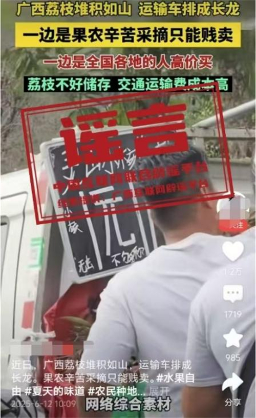 真相:6月12日,網(wǎng)傳“近日廣西荔枝堆積如山,運(yùn)輸車排成長龍。果農(nóng)辛苦采摘只能賤賣”的視頻,畫面顯示荔枝堆積和“靈山荔枝1元”字樣。經(jīng)核查,視頻內(nèi)容并非發(fā)生在靈山縣。目前,靈山荔枝“妃子笑”等中熟品種逐漸批量上市,大規(guī)模上市時(shí)間為6月20日左右,當(dāng)前荔枝產(chǎn)銷有序開展,并未發(fā)現(xiàn)個(gè)別媒體報(bào)道的“荔枝滯銷賤賣”“采摘堆積成山”“運(yùn)輸車排成長龍”的情況,也沒有發(fā)現(xiàn)價(jià)格低到1元的荔枝出售。(來源:“廣西互聯(lián)網(wǎng)違法和不良信息舉報(bào)”微信公眾號(hào))