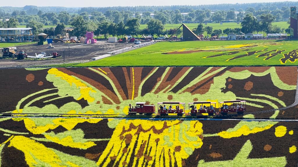 在北大荒集團閆家崗農場的“藝術稻田”里,6幅稻田畫在165畝稻田中徐徐展開——冰雪畫卷盡顯百年冰城魅力,四季生態(tài)畫卷演繹著四季浪漫;萌寵卡皮巴拉,傳遞出平靜與治愈的力量;后羿射日、女媧補天、神筆馬良這些經典神話在稻田中煥發(fā)新生,與多彩的稻浪共同演繹著中華文明的永恒魅力。100多公里外,北大荒集團四方山農場的玉米田,青紗帳漸染金黃,工作人員張昊正遙控無人機,巡航監(jiān)測作物成熟度,科技與傳統(tǒng)在此刻共舞。