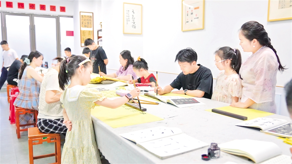 “我們來(lái)看下這‘?!?,是左右結(jié)構(gòu)的字,左邊的偏旁是一個(gè)三點(diǎn)水,三點(diǎn)水寫(xiě)的時(shí)候要注意連貫性……”書(shū)法老師細(xì)致地拆解著漢字的書(shū)寫(xiě)技巧,耐心指導(dǎo)著現(xiàn)場(chǎng)的每一位學(xué)員。