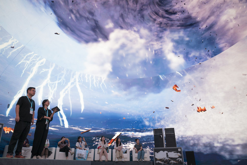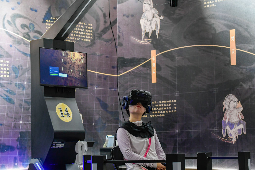 2024年7月22日,游客在“尋境敦煌——數(shù)字敦煌沉浸展”借助VR設(shè)備沉浸式游覽莫高窟第285窟虛擬場景。“尋境敦煌——數(shù)字敦煌沉浸展”綜合運用VR虛擬現(xiàn)實、三維建模、游戲引擎的物理渲染和全局動態(tài)光照等新技術(shù),高精度立體還原了莫高窟第285窟。游客戴上VR眼鏡,不僅可以零距離觀賞壁畫、360度自由探索洞窟細節(jié),還能“飛升”到窟頂,身臨其境參與壁畫故事情節(jié),沉浸式感受敦煌文化的魅力。