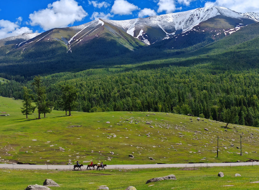 2024年6月4日,游客在新疆阿勒泰地區(qū)哈巴河縣騎馬游玩。電視劇《我的阿勒泰》播出后,新疆阿勒泰地區(qū)迎來客流高峰,“張鳳俠的小賣部”“巴太樹”“彩虹布拉克”等劇中地點成為熱門旅游打卡地。這場“邊城”與“熱劇”雙向奔赴的文旅盛宴,為當?shù)亟?jīng)濟發(fā)展帶來新的增長點。2024年5月,當?shù)亟哟慰?15.03萬人次,同比增長60.81%;實現(xiàn)旅游收入36.53億元,同比增長88.25%。