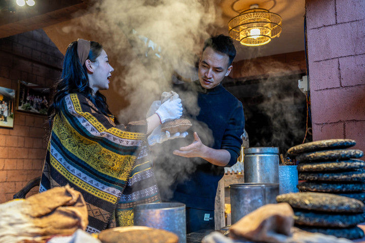 2024年4月13日,一名俄羅斯塔斯社記者(右)在大理市體驗(yàn)包裝下關(guān)沱茶。據(jù)統(tǒng)計(jì),2025年1月至6月,云南省接待入境過夜游客251.03萬人次,同比增長(zhǎng)86%。