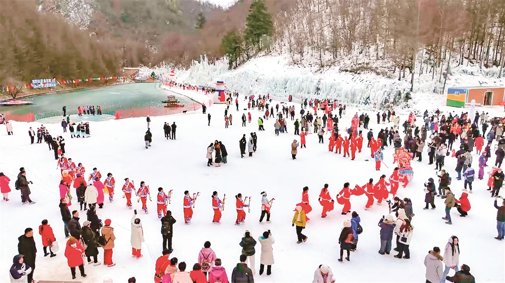 元旦期間,平利縣以“冬賞雪·趣平利”為主題,創(chuàng)新推出冰雪文旅融合系列活動(dòng),打造集觀賞、體驗(yàn)、美食于一體的冰雪樂園。圖為1月2日,游客在平利縣八仙鎮(zhèn)天書峽景區(qū)游玩。 沈奕君 攝