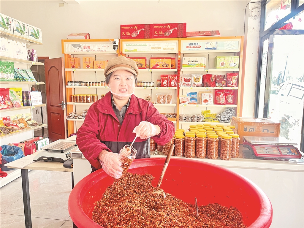 生意有了起色,丈夫的身體也逐漸康復(fù),生活終于重新亮堂起來。作為鎮(zhèn)人大代表,劉小洪深知,一人富不算富,大家富才是真的富。她主動(dòng)分享直播帶貨經(jīng)驗(yàn),帶動(dòng)周邊村民參與特產(chǎn)加工和網(wǎng)絡(luò)銷售。她優(yōu)先聘請村里的留守婦女和困難家庭來幫忙,手把手教她們技術(shù)。為了保證產(chǎn)品的純正鄉(xiāng)味,她堅(jiān)持從本村及周邊村采購黃豆、辣椒、野油菜、干豇豆等原材料,平均每年收購約1萬公斤黃豆、2000余公斤辣椒、2000余公斤野油菜及干豇豆,讓鄉(xiāng)親們的農(nóng)產(chǎn)品有了穩(wěn)定銷路,也變成了實(shí)實(shí)在在的收入。