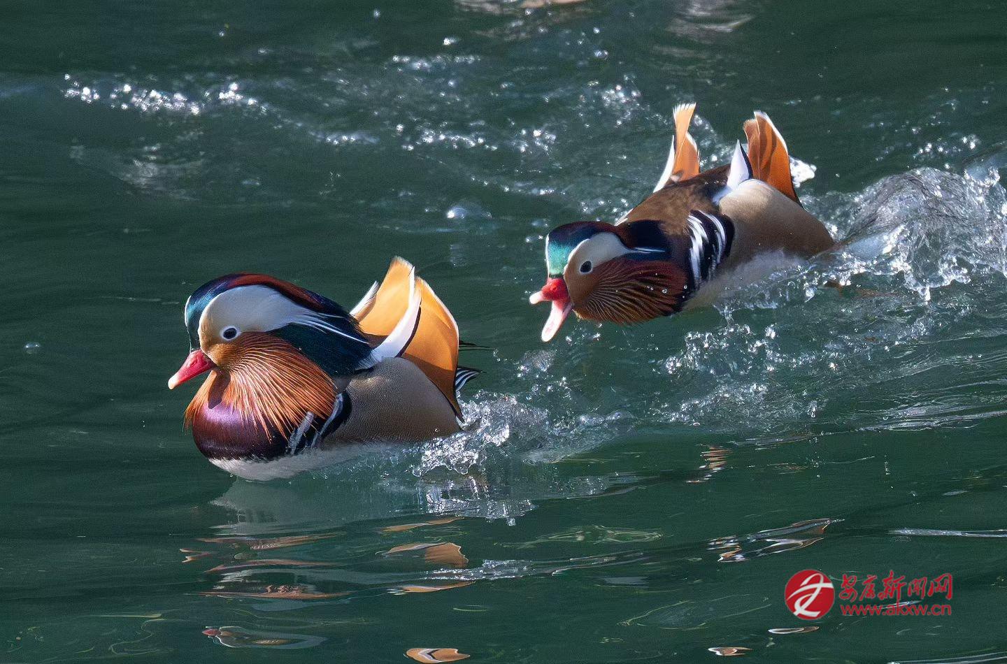 暖陽下,鴛鴦三五成群,在水庫里游來游去,時而嬉鬧戲水,時而將頭探入水中啄食小魚,靈動的身影在水面漾開層層漣漪。
