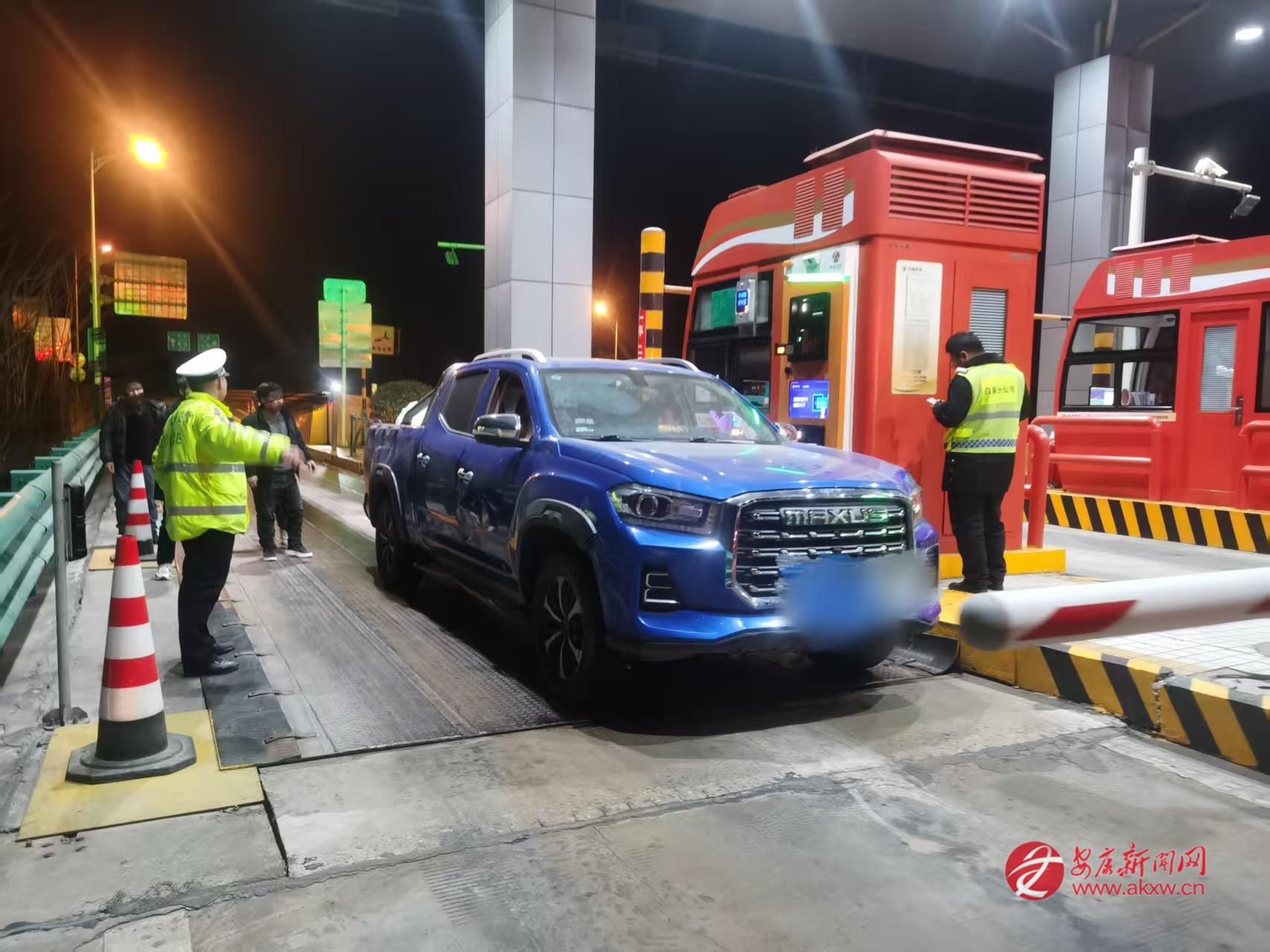 面對這一突發(fā)險情,執(zhí)勤民警立即開啟警燈、鳴響警笛,在來車方向150米處規(guī)范擺放警示標志,設(shè)置安全防護區(qū)域,并指揮后方車輛減速慢行,有效防范二次事故發(fā)生。經(jīng)初步檢查,該車因故障已完全喪失動力,現(xiàn)場無法修復,且故障點距離前方雙河收費站僅300余米。考慮到春運期間路面清障資源緊張、拖車抵達耗時較長,為迅速消除隱患、保障春運通行效率,民警在確保安全的前提下,克服車輛自重較大、夜間視線不佳、周邊車流復雜等情況,聯(lián)合車內(nèi)人員合力徒手將故障車輛平穩(wěn)推至收費站外安全區(qū)域,及時恢復了匝道正常通行。