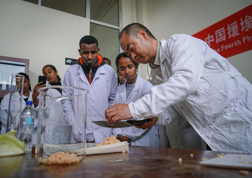 2025年8月20日,在埃塞俄比亞首都亞的斯亞貝巴,中方專家在亞的斯亞貝巴理工學(xué)院對(duì)大學(xué)生進(jìn)行菌種制作技術(shù)指導(dǎo)。新華社記者 韓旭 攝