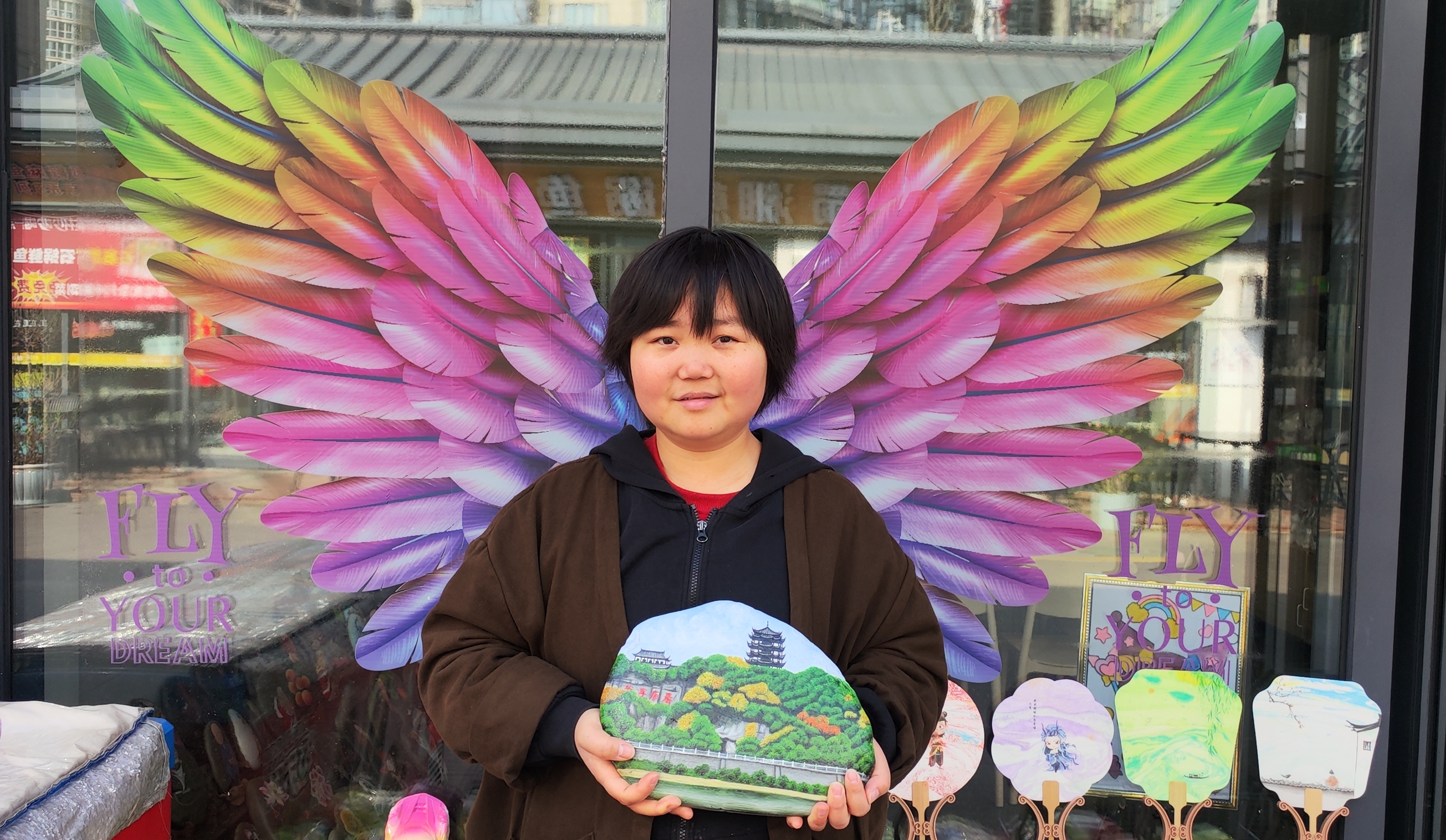 在她店鋪門口的玻璃柜上,貼著一雙展開的彩翼,手捧石頭畫的李景麗,眼神明亮、笑容溫婉,恰似破繭重生的蝴蝶,歷經(jīng)風雨洗禮,依舊振翅翱翔,用手中的畫筆續(xù)寫著屬于自己的芳華,也用堅韌與熱愛,詮釋著新時代普通人不屈不撓、逐光前行的精神力量。
