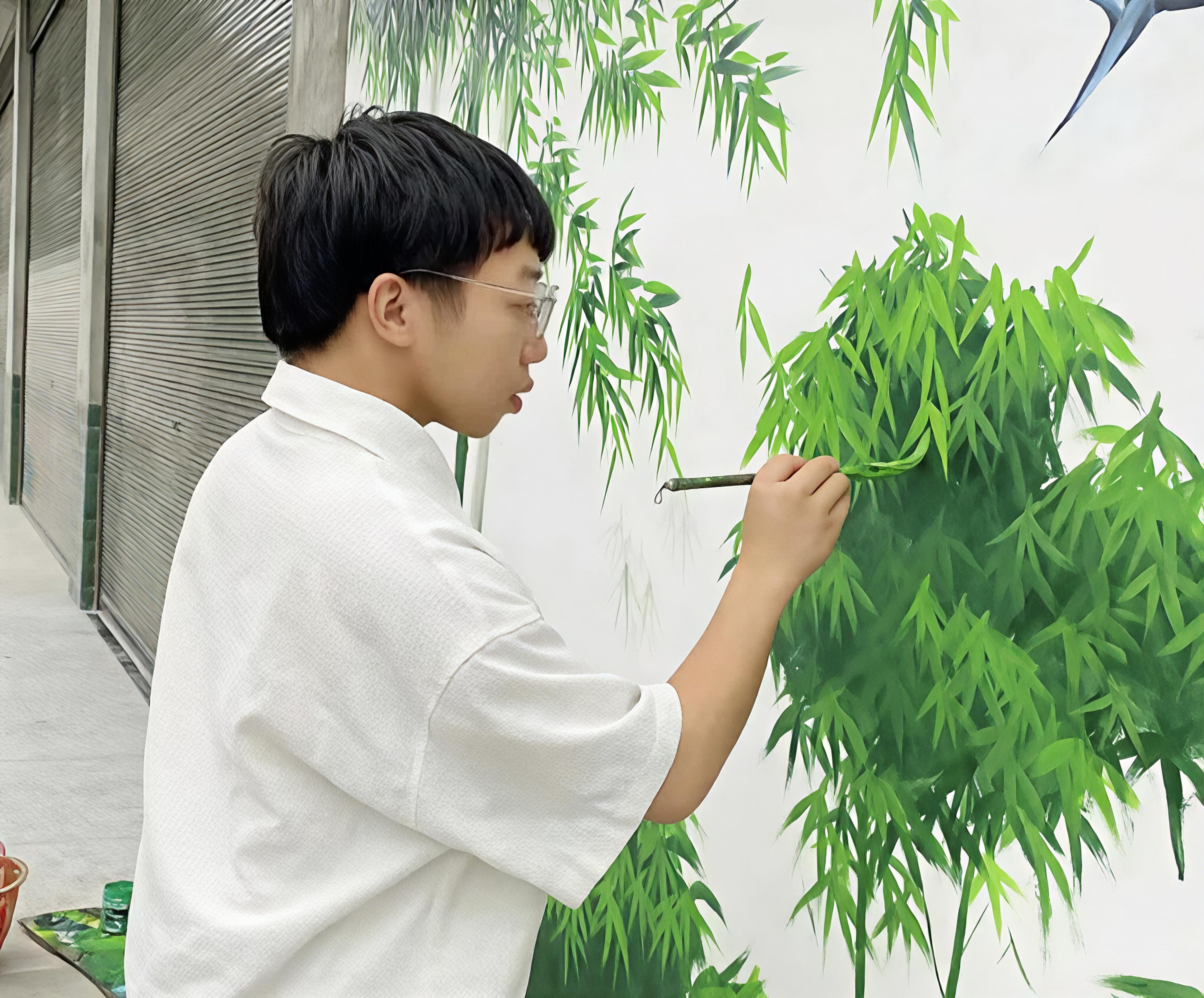 張家壩村,1998年出生的游乙山正蹲在墻角專注創(chuàng)作,不多時,一面栩栩如生的文化墻便呈現(xiàn)眼前,與青山綠水、整潔街道相映成趣,勾勒出鄉(xiāng)村振興的美好畫卷。這位土生土長的正陽青年,畢業(yè)于湖南文理學院,憑借扎實繪畫功底,在鄰縣創(chuàng)辦“藝山美學館”,從事美術培訓和墻體彩繪。
